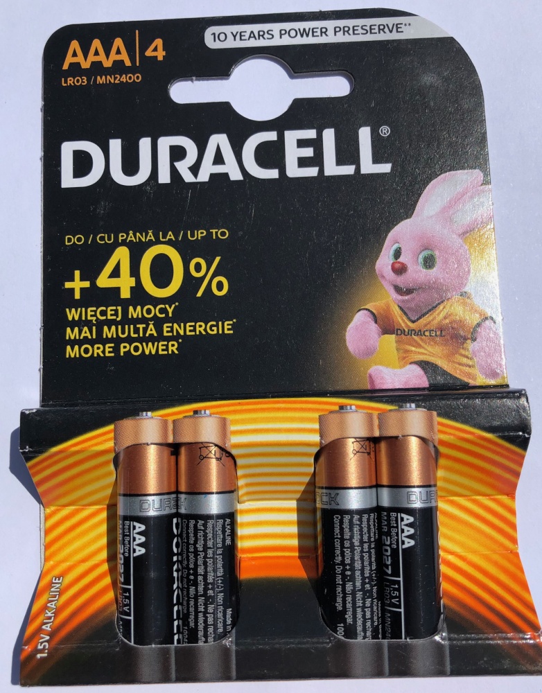 • Blister pack of 4 Duracell AAA Alkaline Batteries